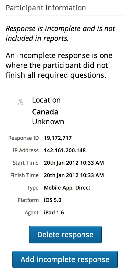On the right-hand side of the screen, you can check out some information about the response and the participant. You can choose to either delete the response or add the incomplete response to your reports: