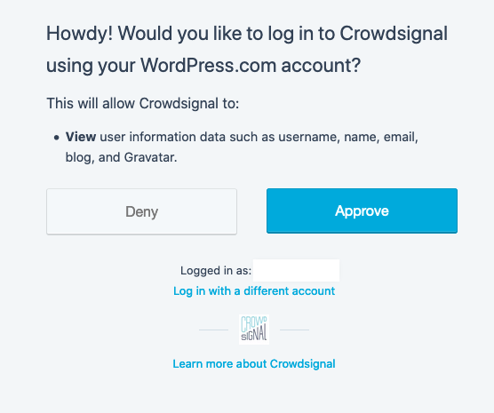 Once you approve Crowdsignal, each time you return to Crowdsignal, you will log in using your WordPress.com account.