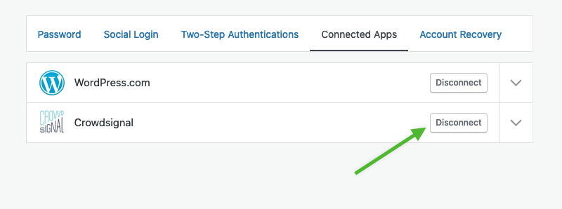 Go to Security > Connected Applications and then click Disconnect next to Crowdsignal.com to remove Crowdsignal.com’s access to your WordPress.com account:
