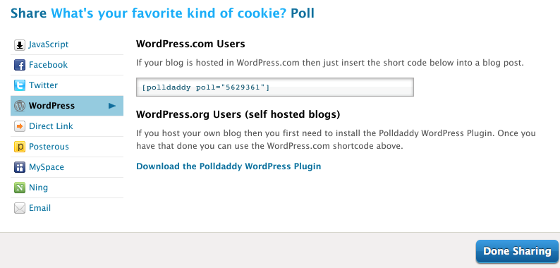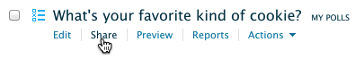 Once you’re ready to embed your poll, hover over the title of it in your Polldaddy.com dashboard and click on Share: