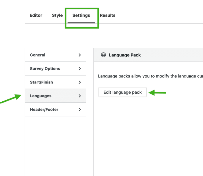 To do so, edit your survey and click on Edit Language in the tabbed navigation. Click on Edit language pack.