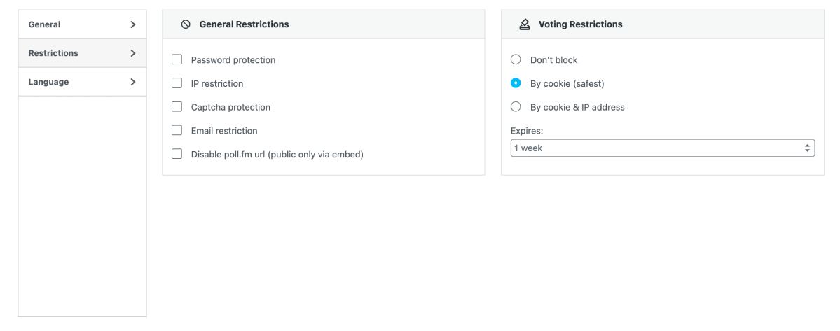 This is the most secure method to block votes. It allows one vote per IP address. If you wish to allow repeat voting, you can select a block period from the Expires: dropdown list. For example, if you wish to allow voters to vote once every hour, set the block to expire in one hour.