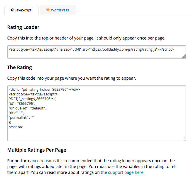 The default option is to copy and paste JavaScript. You can also click ‘WordPress’ to get shortcode to use on your WordPress.org or WordPress.com site.