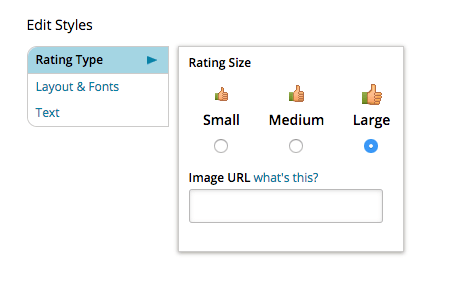 - In the Rating Size box, you can select the size of the thumbs. If you’d like to use something other than thumbs, you can include the image URL in the box.