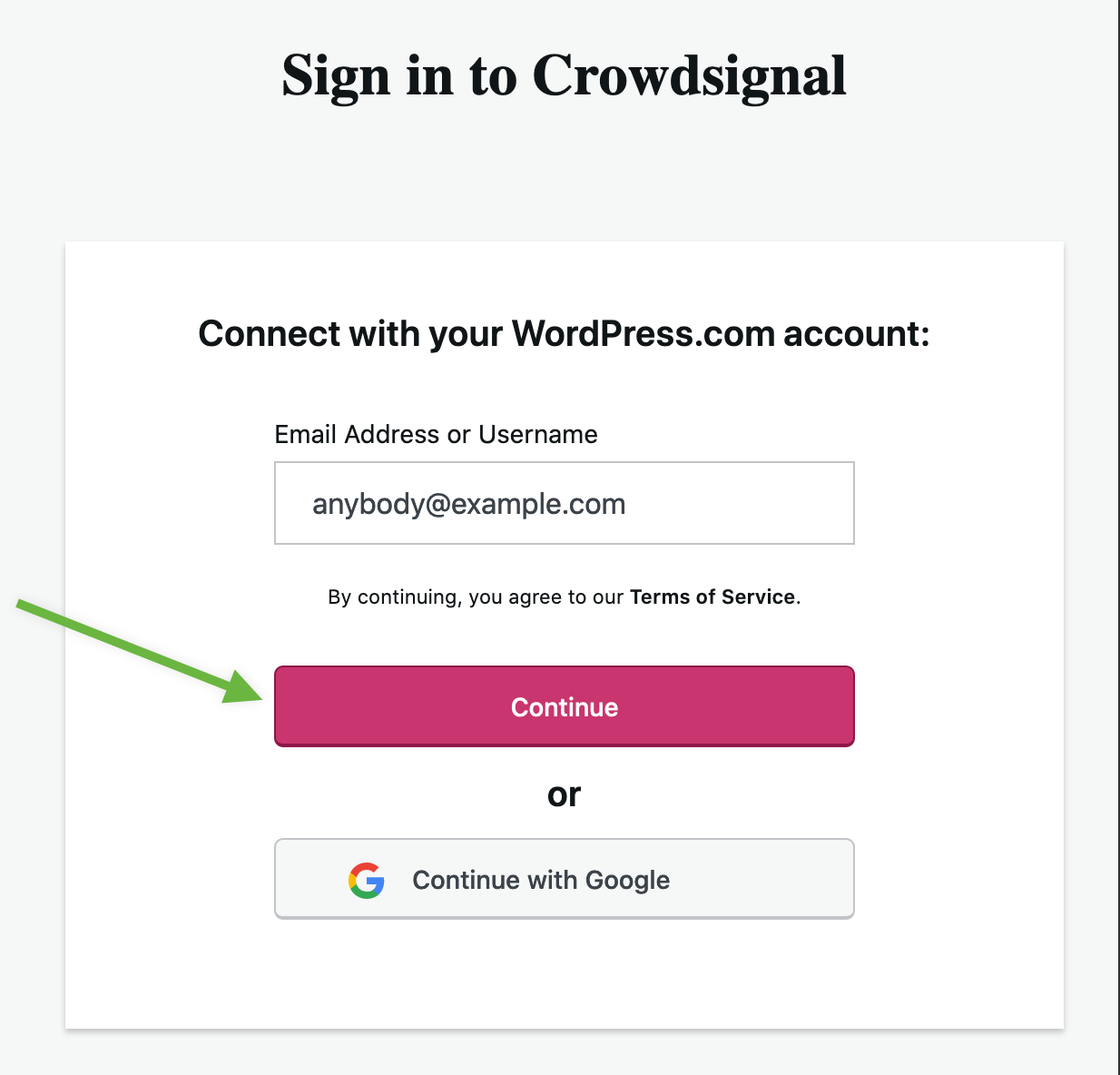 - Go to the Login page and enter the email address or username associated with your WordPress.com account, then click ‘Continue’: