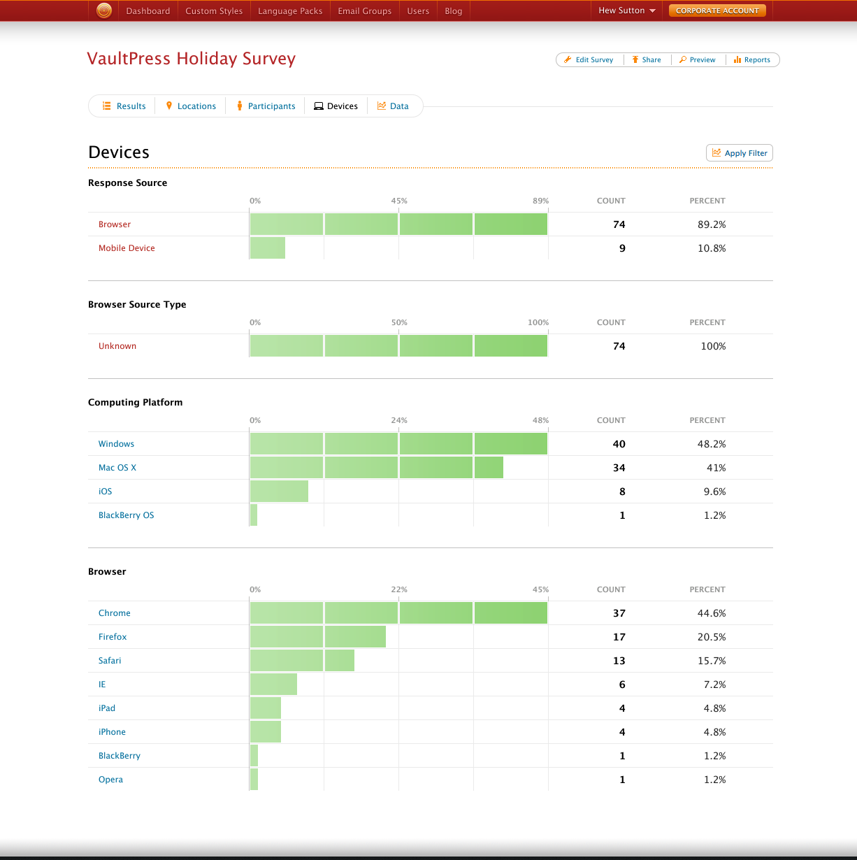 We’re pleased to announce a new feature for Professional and Corporate account holders. Eagle-eyed customers may have noticed a new menu item appear on the Reports screen late last week. Check out the new Devices report to learn which devices, web browsers, operating systems, and web browser versions your survey participants are using when they complete your survey.