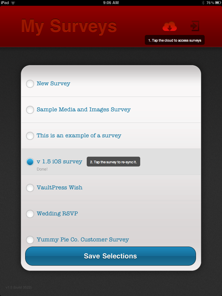 Once you’ve opened the Polldaddy iPad app, click on the Cloud icon to see a list of your surveys. Tap the survey you wish to sync, and click on the blue, Save Selections button: