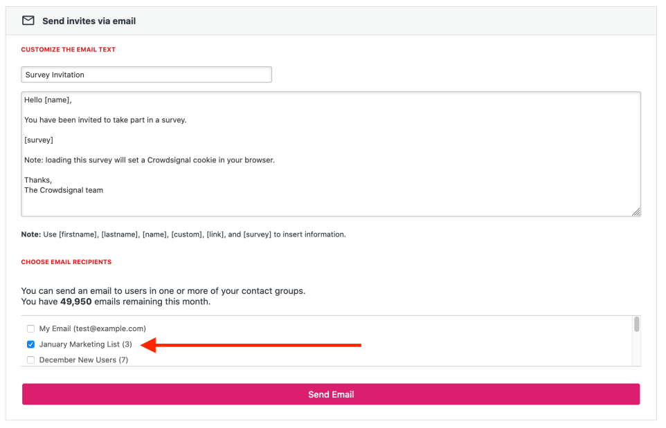 To be able to send out polls, surveys, and quizzes via email, you need to create a Contact Group (previously named Email Group) and customize the email text before you send it out. A Business or Team plan is required to send email through Crowdsignal.com now.