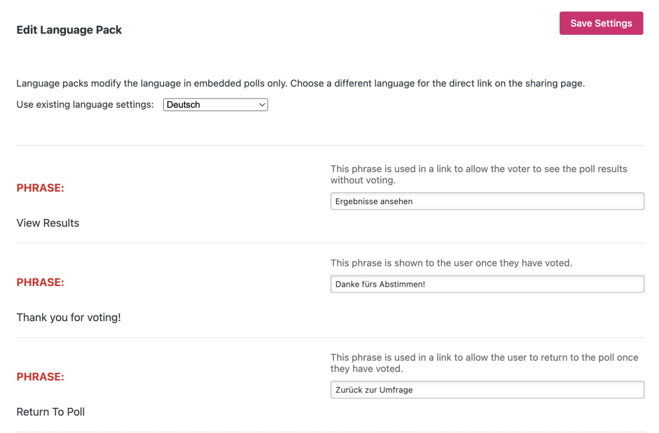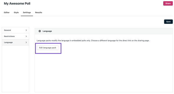 To get started, edit a poll and open Settings > Language > Edit Language Pack: