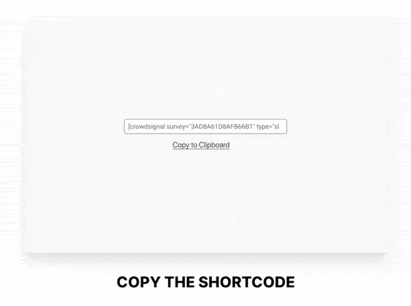 Insert the survey directly into your website using an auto-resizing iframe. Simply copy the code snippet into your clipboard, go to the HTML code of your website and paste the snippet wherever you would like to embed your survey.