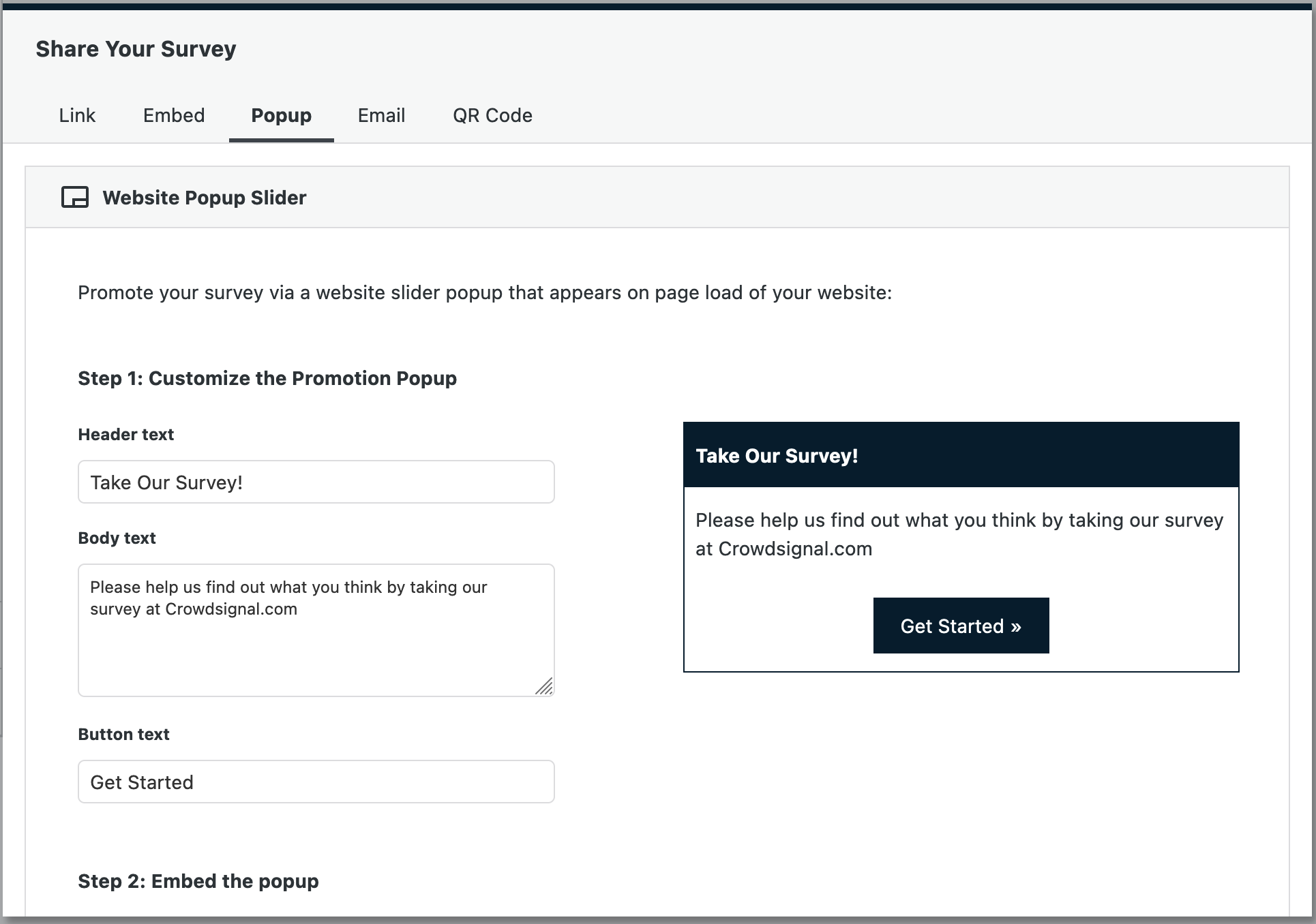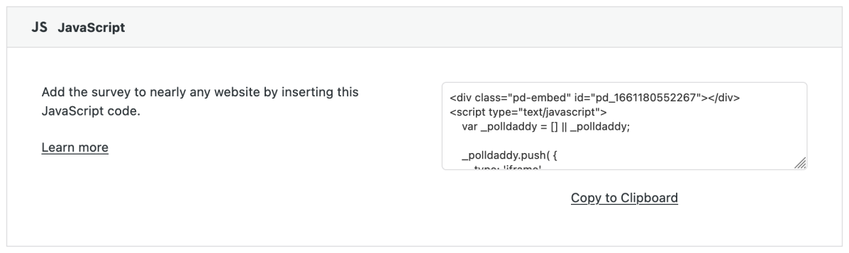 The third option is to embed your survey into your website via pasting our javascript code snipped into your site’s code.