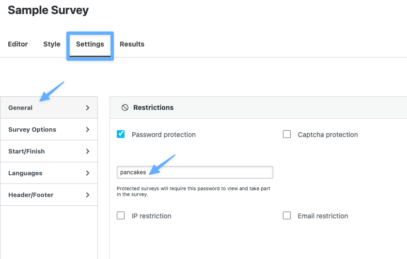 Once you’ve created your survey, you can set up the password restriction in the Settings > General: