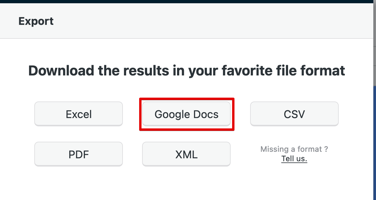 This method allows you to securely upload your data directly into a Google Docs account. Click on the “Google Docs” export option: