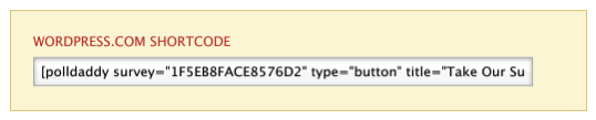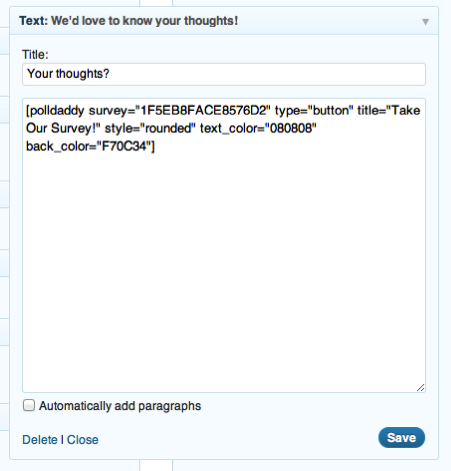 Type in a title for your survey popup, and paste the WordPress shortcode into the body of the Text Widget: