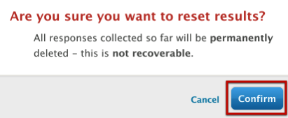 If you’re sure you want to permanently delete the test responses, accept the confirmation. Note that once survey results have been reset, there is no way to retrieve them. Be absolutely sure when resetting survey results: