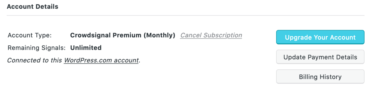 First, login to your Crowdsignal account. You can see your Billing History under Account Details on your My Account page: