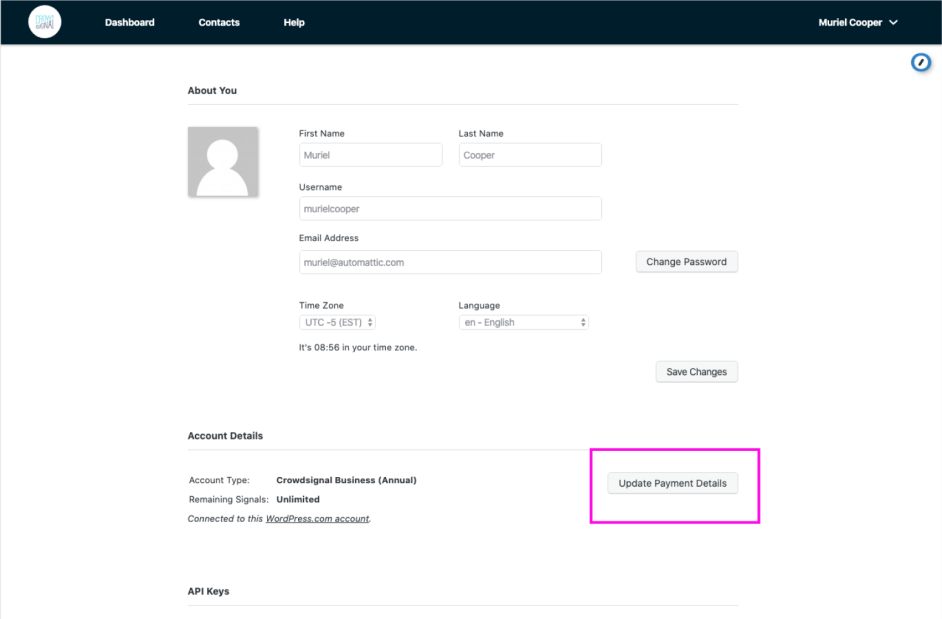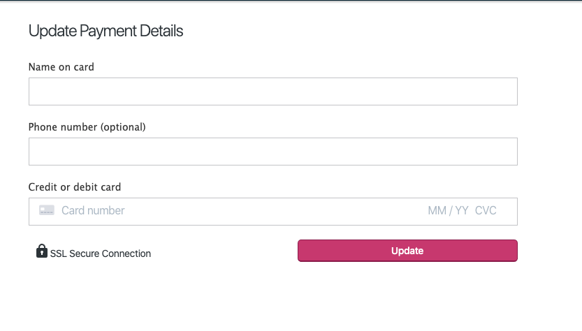 Your payment details can be updated by looking at the sidebar of your account page for the Update Payment Details button.