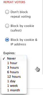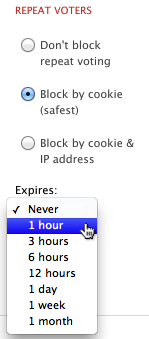 This is the most secure method to block votes. It allows one vote per IP address. If you wish to allow repeat voting, you can select a block period from the Expiry dropdown list. If you wish to allow voters to vote once every hour, set the block to expire in one hour, etc., etc.
