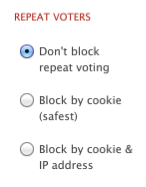 Polldaddy offers three settings to choose from for repeat votes: don’t block repeat votes, block by cookie, and block by cookie and IP address. You can find vote blocking options by hovering over the title of your poll in your dashboard, and clicking Edit. You’ll find the blocking options at the bottom of the poll editing screen under Poll Options.