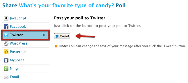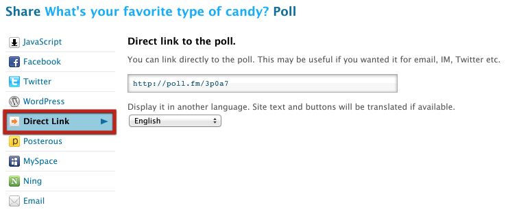 This brings up the Share pop-up. On the Share pop-up, You’ll see several different embedding options, including JavaScript, Facebook, Twitter, WordPress, Posterous, MySpace, NING, and Email. (The Direct Link option is shown to paying customers who have created public polls.)