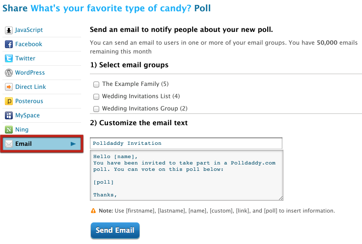 If you like, you can send out your poll embedded in an email, to a group of participants. First, you need to create an email group, by uploading a CSV file of your names and email addresses. Once you’ve got your email group in place, hover over the title of your poll in your dashboard and select Share. On the Share pop-up, select Email. If you have more than one email group, you’ll be able to select it from the list. Be sure to customize your email message before you send it out: