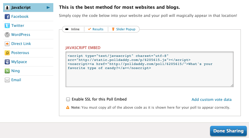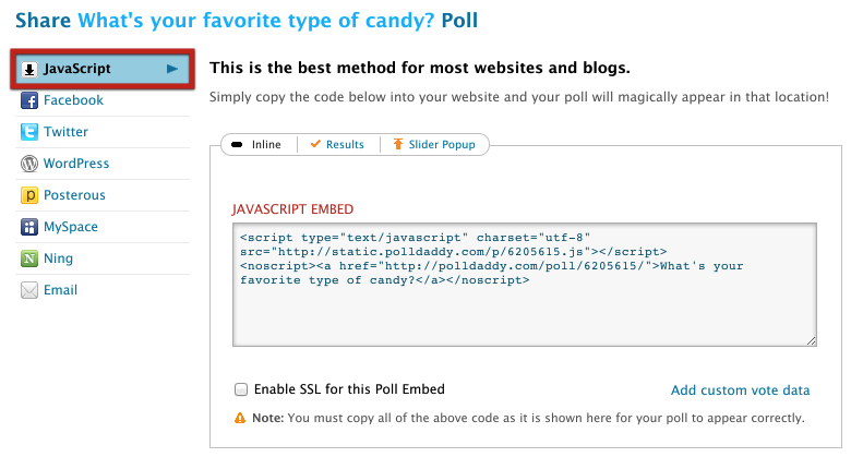 If your site isn’t on WordPress, we recommend embedding your poll into your site using the JavaScript code we supply. From among the options on the left-hand side of the Share pop-up, select JavaScript. You can choose to embed the poll inline as part of a blog post, or select the Slider Pop-Up method to have your poll pop-up in a small sliding window when the page loads. You can also choose to embed only the poll’s results. Be sure to copy all the JavaScript code we supply and paste it into your site. We offer secure polls via SSL for paid account holders only.