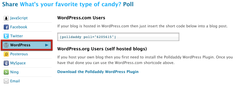 To embed your poll on your WordPress site, select WordPress from among the options on the left-hand side of the Share pop-up. Copy the WordPress shortcode we supply and paste it into a new post on your WordPress site: