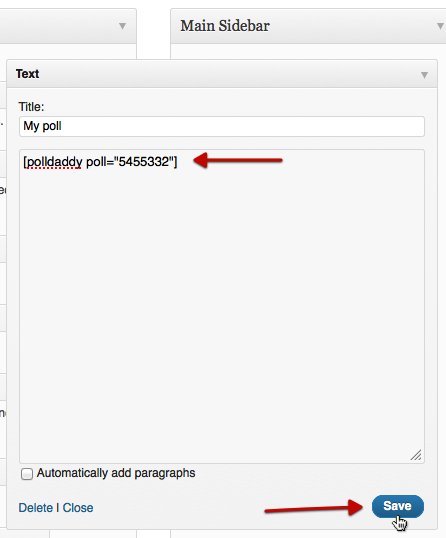 Next, paste the WordPressshortcode into the body of the Text widget. Be sure to click on the blue, Save button: