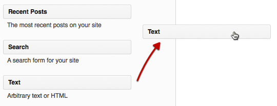 On the left-hand side of your WordPress dashboard, click on Appearance, and then Widgets. You’ll see a list of widgets that you can use for your site. Find the Text widget. Click on it, then drag it up to your Main Sidebar area: