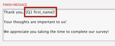 We’ll set up question piping to include the participant’s first name in the custom finish message to personally thank them for completing our survey. Note that we’ve added [Q1 first_name] to our custom finish message text. This pulls the answer the participant provided in the first name field of question one, and places it into the custom finish message. If you like, you can add the last name, too, using the following: [Q1 first_name last_name].