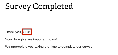 Here’s the custom finish message, with the answer to the first name field from question one, piped in: