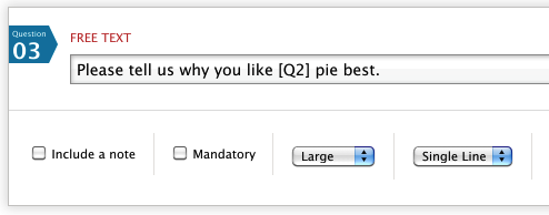 On question three, we want to know why Gus likes the type of pie he chose. We can pipe his answer from question two, into question three, to learn more: