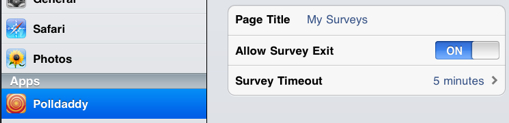 Following on from the kiosk mode we introduced in 1.3.1, there is now an optional timeout setting. If enabled this will cause the app to reset to the start of the current survey if no response is entered within a certain time.