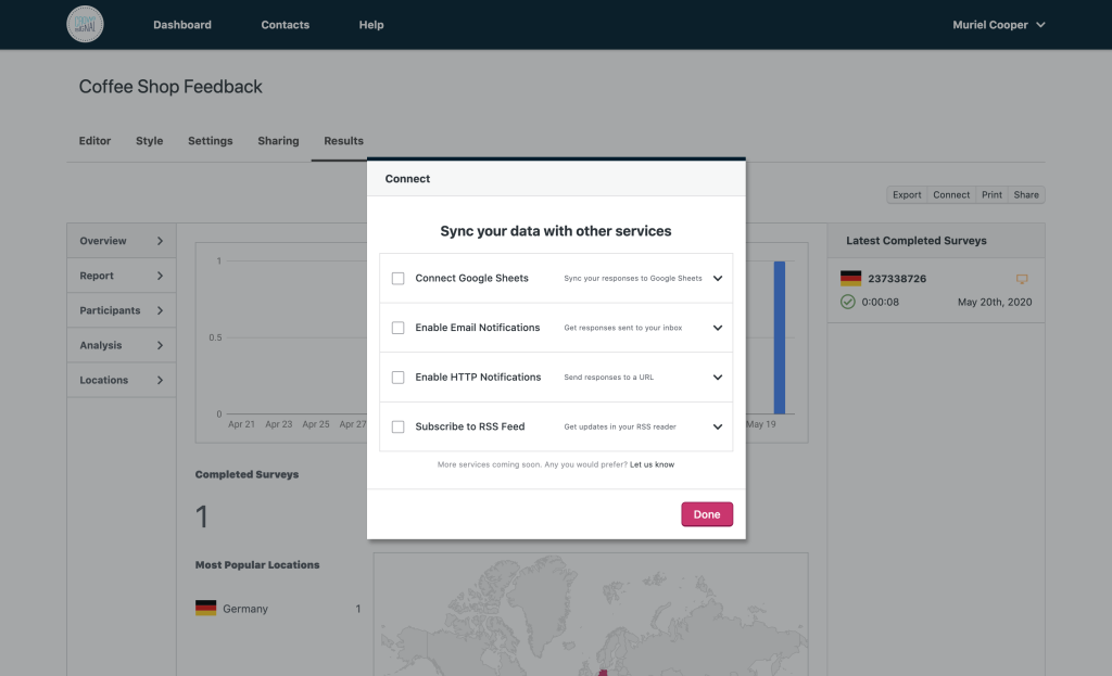 You can monitor your results in Crowdsignal, export them via several file formats, or sync them in real time with a service like Google Sheets, via the “Connect” option.