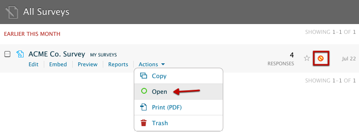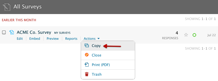If you need to open, close, copy, print, or trash a survey quickly, the contextual Actions menu is the place to go to do these most frequently used actions on your survey. In this brief article, we’ll cover how it works. The contextual actions menu is identical for surveys and quizzes. We’ll review how each menu item works, using a survey as an example.