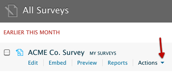 To reveal the contextual Actions menu, hover over the title of your survey in your dashboard: