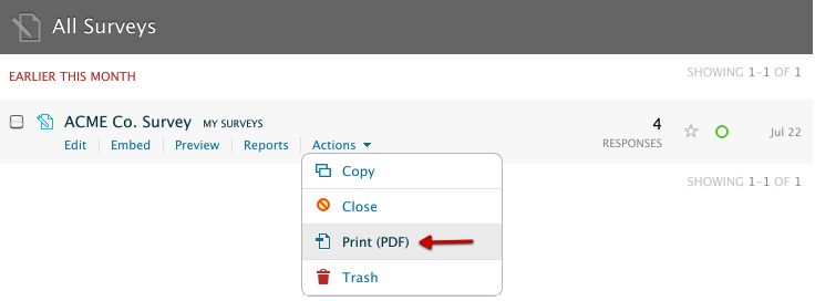 To print a PDF copy of your survey, all you need to do is hover over the contextual Actions menu and click on Print. The rest is magic.