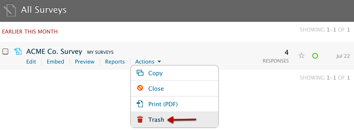 Finally, if you no longer need your survey, you can easily send it to the trash from the contextual Actions menu. Simply hover over the title of your survey, click on the Actions menu, and select Trash.