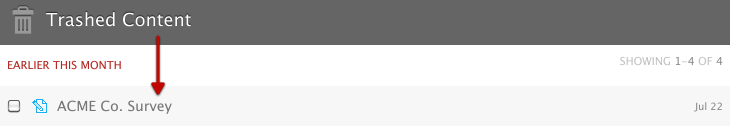 If you click on the Trash icon, located at the bottom of your list of folders on the left-hand side of your dashboard, you’ll see your newly trashed survey.