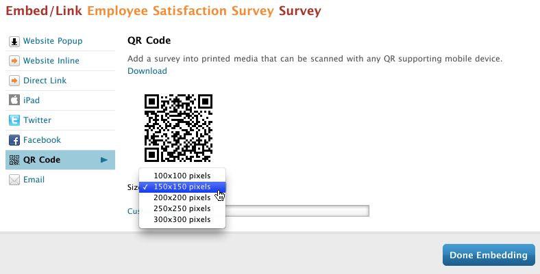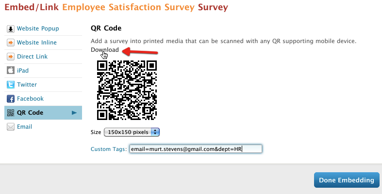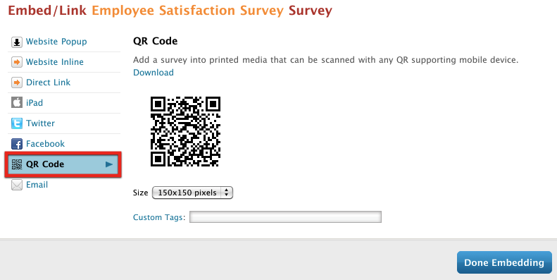 Great news! We’ve added a QR code option to our survey and quiz embed methods. This allows you to embed a link to a survey or quiz into a QR code and download a .png that you can use in printed material, such as brochures, flyers, and newsletters. What’s more, you can use Custom Survey Tags to flag specific data in your responses. Here’s how to use a QR code embed: