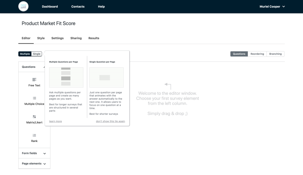 Create a new survey and choose the “Single Question per Page” mode — it’ll show respondents one question at a time, which is useful for this kind of survey.