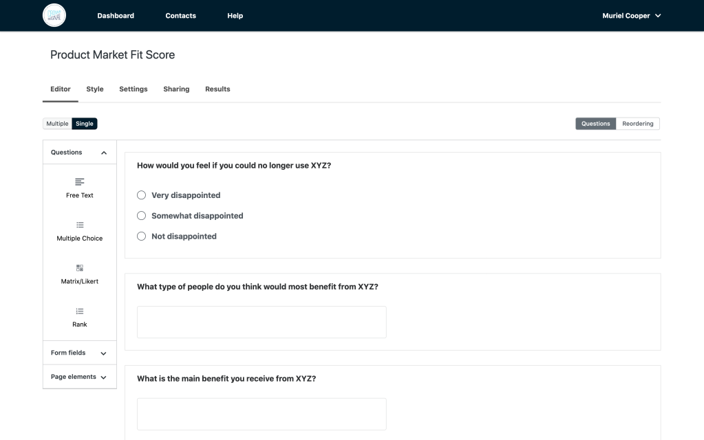 Add the four questions using the Multiple Choice and Free Text questions. Set the first question — which is key for determining your PMF score — as mandatory. Here are the questions and answers again — feel free to cut and paste: