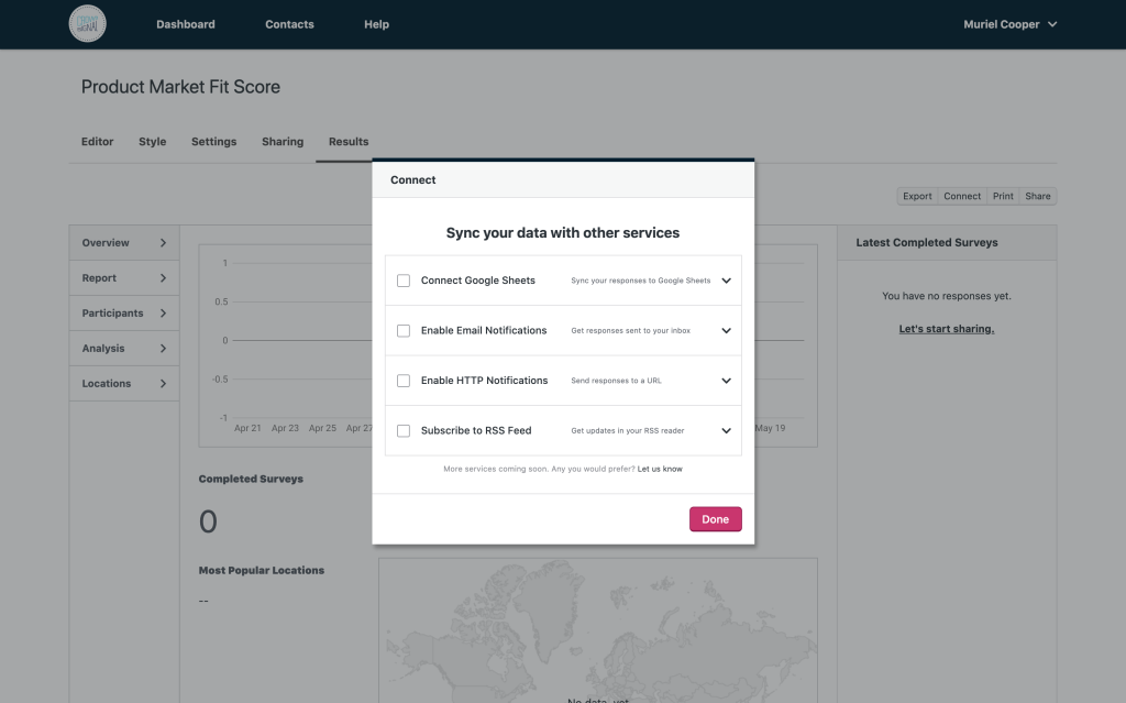 To set this up, go to the “Results” tab and choose “Connect.” In the pop-up window, choose “Connect Google Sheet.”