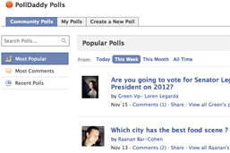 As some of you may have already seen we have been testing out a new PollDaddy application on Facebook. Today we are officially launching it! We know from support that a lot of users have been trying different way to integrate their polls with their Facebook communities. Well now you can manage all of your polls directly in your Facebook account. Once you add the application you can create polls and share them with your friend and the wider Facebook community. You can also track all of your votes and comments for the first time. To get started just add the app from the link below and start polling!