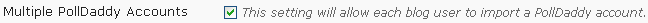 If this is set, the next time the user logs into the blog, they will need to import a Polldaddy account to access the Polls dashboard. This can provide an extra level of security to the polls on an admin or editor account as each user, regardless of the blog account type (admin, author, contributor.. etc), will be only able to edit polls on an account that they have access to.