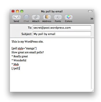 If you’re using PollDaddy in conjunction with WordPress.com there’s a great new feature that allows you to create polls by email. First you’ll need to create a special Post by Email secret address. You can then create polls by embedding a special shortcode in your email and sending it to the secret address: