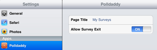 A lot of users have written in to say that they’d like to use the Polldaddy app in a ‘kiosk’ mode – a locked down iPad that prevents participants from leaving a chosen survey. Although we can’t prevent people pressing the ‘home’ button, there is now an option to disable the exit survey button. Once enabled, you will be able to start a survey and the only way to then exit is to close the app.