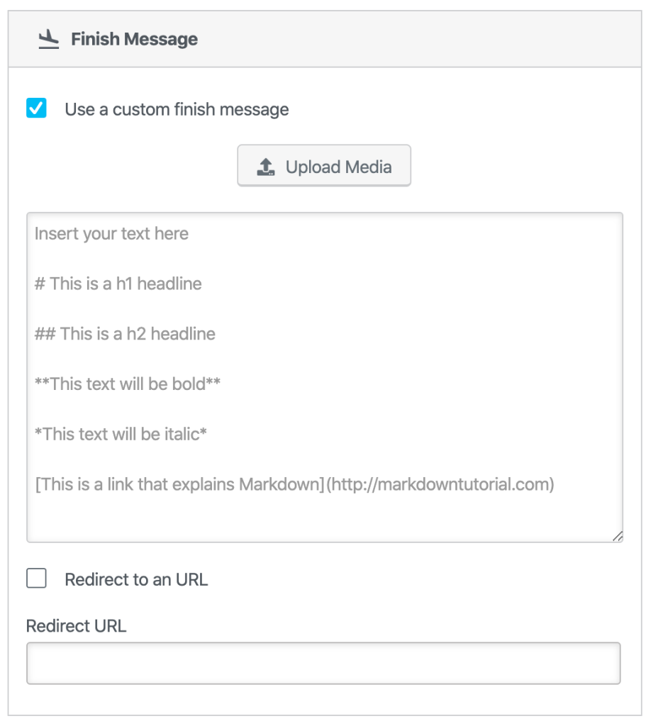 If you prefer, you can select Redirect to an URL instead, and enter a URL where your participants will be redirected after completing the survey.