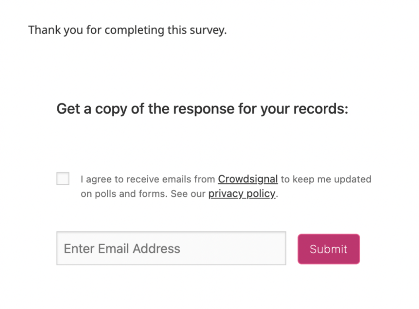 By default, after finishing the survey, your survey participants will be presented with the option to receive a copy of their survey responses via email.